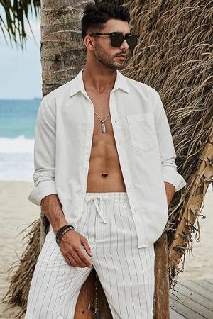Clothing Match: Mens beach shirt could be easy to match with linen shorts/pants, casual pants or shorts to create a simple but fashionable style. These casual shirts are great either solo buttoned up or worn unbuttoned over a form fitting t-shirt/tank.