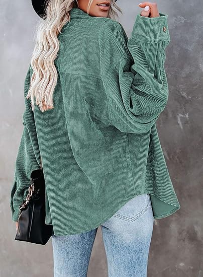 Feature: Corduroy Fabrication, Solid Color, Front Button Closures, Bust Pocket, Long Sleeves with Button Cuffs, Boyfriend Style, Turn-Down Collar, Loose Fit Shirts. It can be tied at the waist or wrapped around waist, wear as 3/4 sleeves or full sleeve
